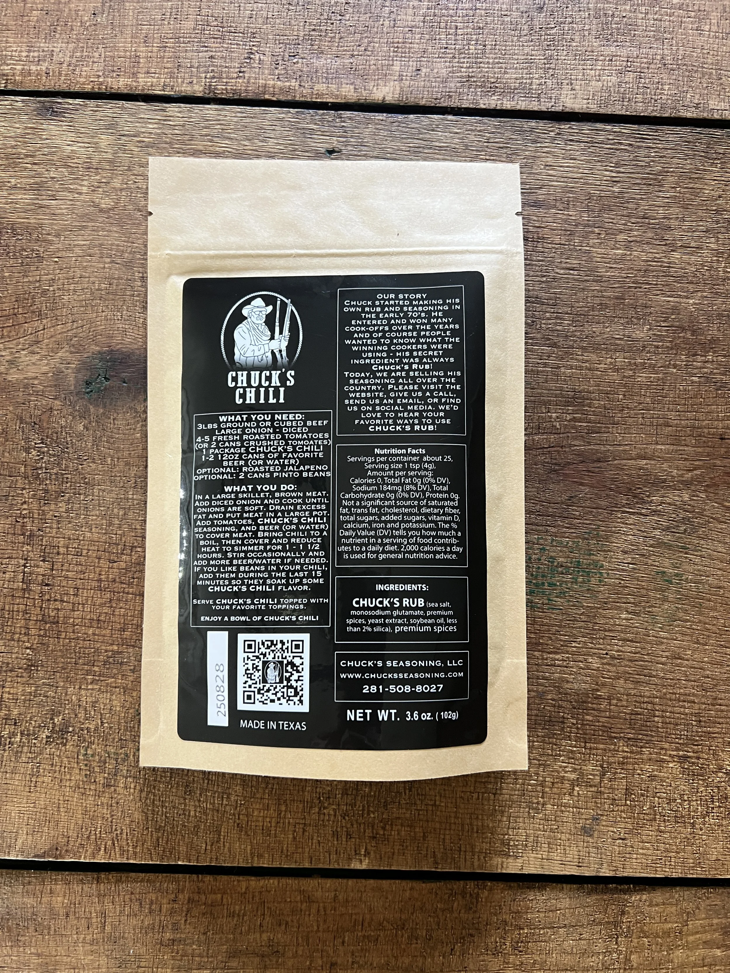 CHUCK'S CHILI 3pk INCLUDES s&h $25.00 CHUCK'S CHILI 1pk - INCLUDES s&h $13.50 CHUCK'S All-Purpose Rub & Seasoning 3 bottles INCLUDES S&H $34.00 CHUCK'S All Purpose Rub & Seasoning INCLUDES S&H $15.00 CHUCK'S All Purpose Rub & Seasoning 1 case INCLUDES S&H $103.00